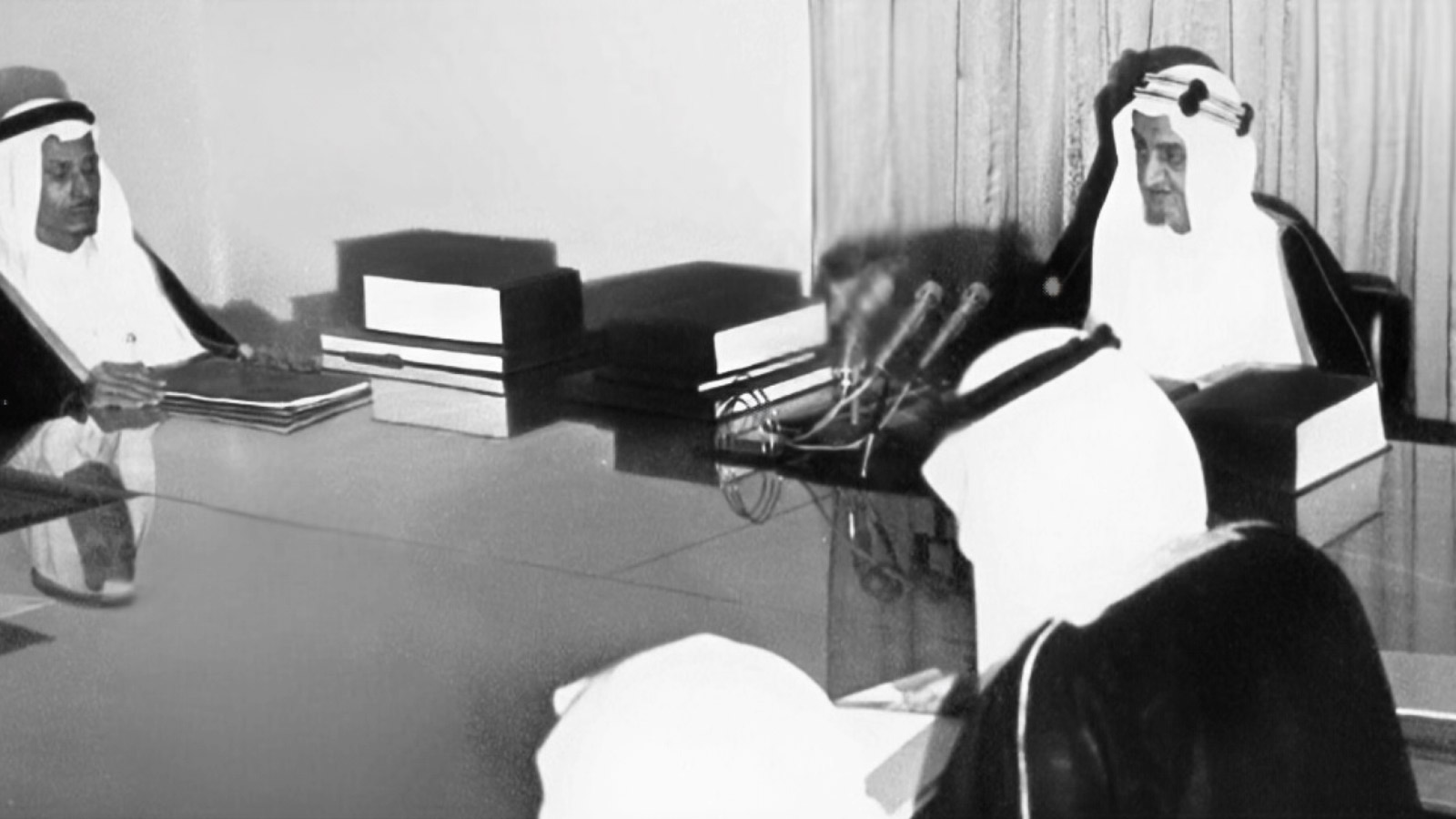 على يمين الملك فيصل في إحدى جلسات مجلس الوزراء